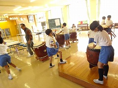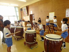 ↓ 1,2年生 地域の先生から、ばちさばきを教わっています。ずいぶん上手になりました。とても楽しそうに「でんでこ太鼓」を受け継いでいます。