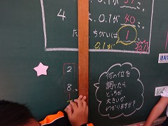 ↓ 3年 算数 小数の大きさの比べ方は、どうするとよいか、考えています。数直線で表したり、数字のどの位を見ると比較できるのか、いろいろ考えています。自分の考えのわけを自分で説明できる子、友達のわけを補える子、これが学び合いです。こんな学び方を目指しています。