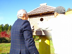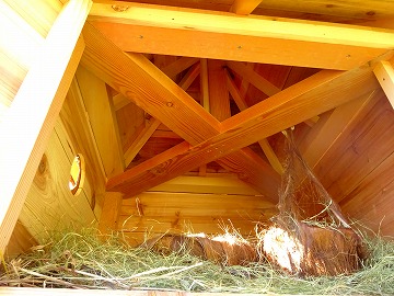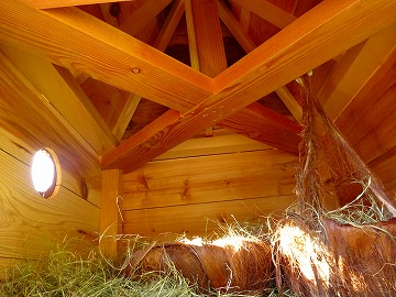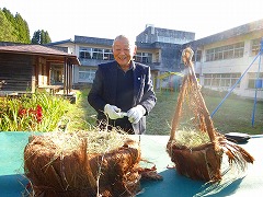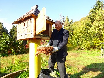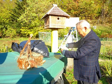↓ 5月24日に笠野小学校の校庭に鳥のお家を造ってくださった坂本会長さんが、今日は、鳥が住みやすいようにと、さらに温かいお部屋を造って持ってきてくださいました。ご自宅のシュロの木の皮をはがして、造ってくださったそうです。