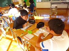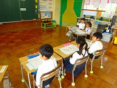 ↓ 2年生 生活科 秋の町探検のまとめをしていました。写真を見て、どんな題名にしようか話し合いました。