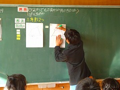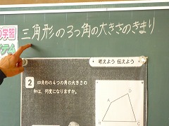 ↑5年算数 四角形の角の和はどのように表すことができるか、三角形の角の和を基にして考えました。自分の言葉で説明できるようになれば、理解も深まります。