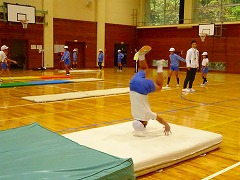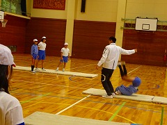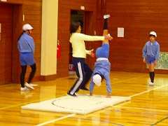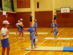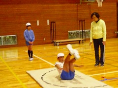 ↓ 5.6年体育 マットの技を極める練習です。美しさ、足の伸び、つなぎの滑らかさを追求しています。担任の師範演技ハンドスプリングは見事でした。