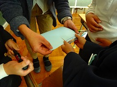 ↓ 2年 国語 教材文「しかけカード」の作り方を読みながら、説明の仕方の工夫を考えました。しかけカードに切りこみを2本入れます。「切りこみみの長さは4センチメートル」、「切りこみと切りこみの間は3センチメートル」です。教材文の説明を読み、その通りに作れるか試してみました。