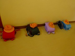 ↓ 校長室に放課後勉強にやってきた3年生4人のランドセルです。廊下に出てびっくりしました。この様子から、思うことは、礼儀正しさ、物を大切にする心、落ち着いた行動、丁寧さ・・・見ていて心が温かく、感動しました。「日々新生」です。