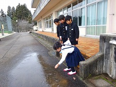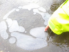 ↑ 水たまりも、学校庭園の池も、学校のプールも氷が張っていました。道が凍っていますので歩くときは転ばないように気を付けてください。ため池や用水には近寄らないようお願いします。