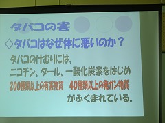 ↑ 子供が煙を吸い込むと、害は非常に大きいのです。それは、細胞分裂を活発にしている成長期にあるからなのです。たばこの他に、アルコールの害についても学びました。自分の健康管理をしていく、そのためには正しい知識が必要なのです。今日は、薬剤師の加藤先生、わかりやすく教えていただき、ありがとうございました。