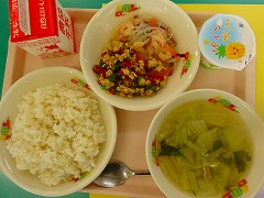 ↑ 今日の給食は「タイ料理」でした。ピリっと辛みの効いたカパオライス、ヤムウンセン、タイ風スープにパインゼリーで、異国情緒を楽しむことができました。