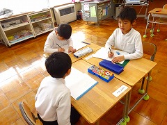 ↑ 1年生も自分の考えを図を描いて、説明もつけて書くことを学んでいます。書くことで自分の考えがまとまり整理されていきます。積み重ねによって、徐々に書けるようになってきました。