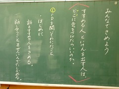業後、学習ガイドと学び合いのモデル学習会をしました。私たちが目指す学び合いを、教師自身が子供役になって、ビデオ撮りをしました。実際に最近行った5年算数の授業内容です。今日ビデオ撮りした目指す学び合いを、児童の皆さんに見てもらおうと思います。どのような学び合い言葉を入れるか結構念入りに打ち合わせをしましたが、実際ビデオ撮りしてみると、自然な形でできました。職員みんなで授業のイメージを共有できました。