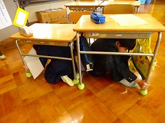 ↑ 休み時間なので教室には先生はいませんが、しっかり机の脚をもって、頭を守っています。