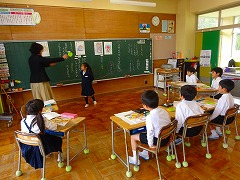 ↑3年生は算数の学習をしています。同時に4年生は同じ学級で算数の学習を進めます。担任は「渡り」といって、両学年を行き来して授業を進めます。担任は2学年分の準備をして授業に臨んでいます。いつも担任がついて進める授業ではありませんので、自分たちで考え、話し合う主体性がさらに必要とされます。複式学級なので致し方ありませんが、それを強みに変え、子供たちの自分から学ぶ力を育てています。これは、今求められている力なのです。