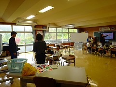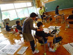 ↑ 1年生は勉強がスタートしています。この時間は算数で、ブロックと数字と、イラストを対応させて、数の概念を育てています。生活の中でも、たくさん数えてください。お皿でも、指でも、数字のカウントダウンでも・・・学校では意欲満々で、楽しく算数の学習をスタートさせることができてます。