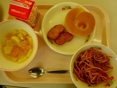 ↑ 今日の給食は、パンとスパゲティと「チキンナゲット」ではなく、「大豆ナゲット」です。フルーツもあって、人気メニューでおかわりをたくさんできました。いつも完食です。
