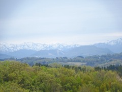 ↑ 朝から小ぬか雨で、遠くの山の景色は霞がかかったようです。