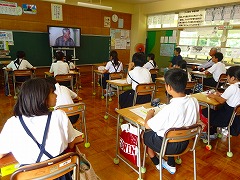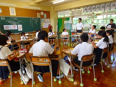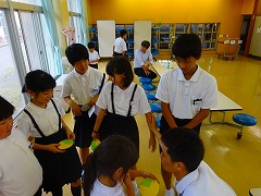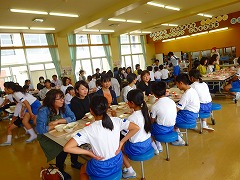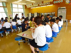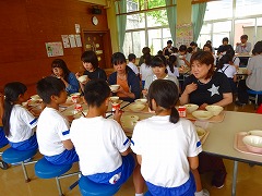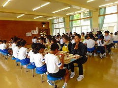 ↑ 給食の時には、全校に紹介して一緒に給食を召し上がっていただきました。