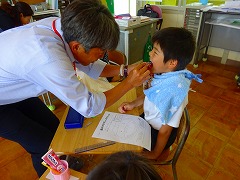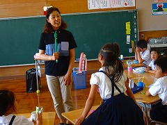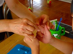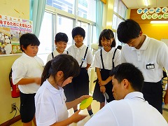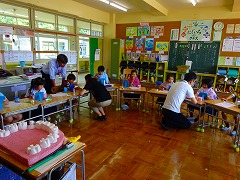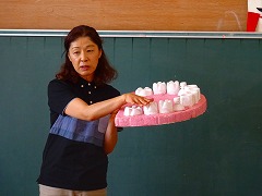 ↑ 1,2年生は染め出しを使って、歯磨き練習です。歯の模型を使って、どんな磨き方をすると、一番奥の背の低い6歳臼歯にまでブラッシで磨けるか、学びました。