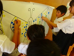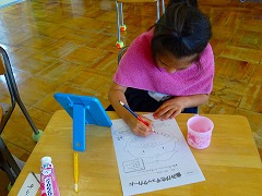 ↑1年 図工 初めての絵の具を使った授業です。まず、使い方の説明をしっかりと聞くことができました。