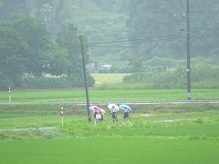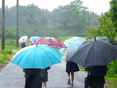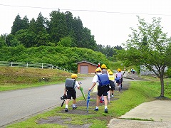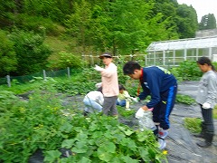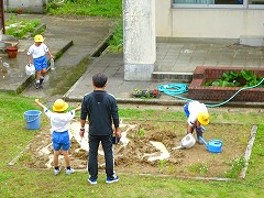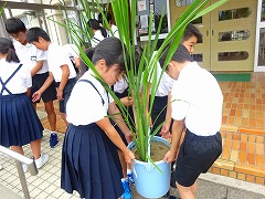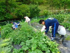 ↑3,4年生 畑の手入れをしました。このところの雨と暑さで、雑草も負けじと伸び放題でしたが、スッキリしました。