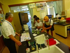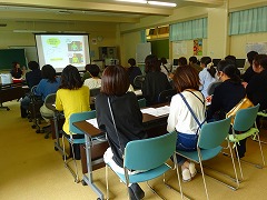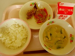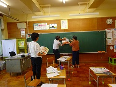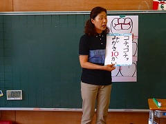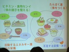 ↓ 給食試食会の後は、萩野台共同調理場の栄養教諭による栄養指導教室です。私はお話をお聞きし、「ごはんとみそ汁だけでは、2時間目までしか脳に栄養のある血液が行かない、それに主菜を加えると3時間目まで、さらに、サラダや副菜を加えると4時間目まで脳に栄養が行き、学習に集中できる」というお話が心に残り、反省しました。保護者の皆さんはいかがだったでしょうか。明日からは、できるとこから実践したいと思いました。