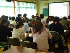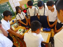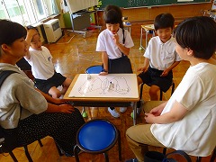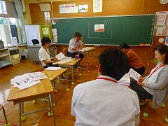 ↑ 業後、道徳の授業づくりの研究を行いました。今回は1年生の道徳の授業です。担任が作成した指導案をもとに、どんな手立てをとると、4人の子供たちが、考えを出し合うことができるか、先生もみんなで意見を出し合って考えました。その結果、より良い案が色々出され、最後に担任が、取捨選択し再構築して授業を行います。よりよいものを目指して、先生方のチームワークもバッチリです。
