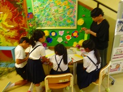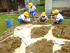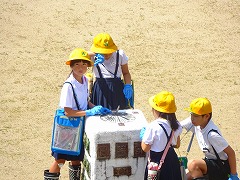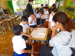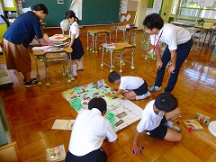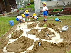 ↓ 1年 図画工作の時間です。砂と水で川や島を思い思いに作り、宝島が出来上がりました。沼にはワニもいるそうです。4人共同作業の力作です。
