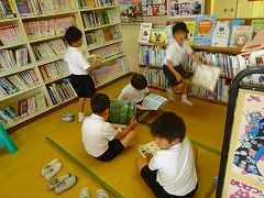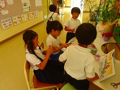 ↑ 2年国語 学校司書さんにレオ=レオニさんの本のブックトークをしていただきました。どんどん読んでみたくなり、本の世界への興味が高まってきます。すぐに手に取って読み、お気に入りの本を見つけました。読書を楽しんでください。