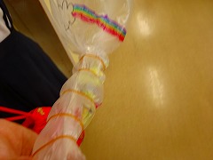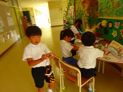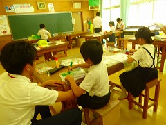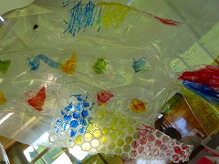 ↑ 3,4年生の図工の授業です。3年生は、空気を入れてふわふわ揺れる材質を生かしてた工作です。4年生は、「ころころがあれ」ビー玉を転がして遊ぶコースを作っています。どちらも夢が広がる図画工作です。