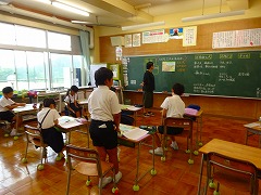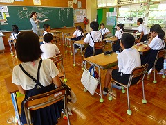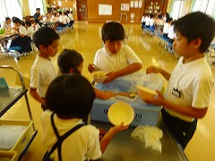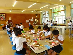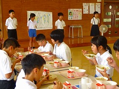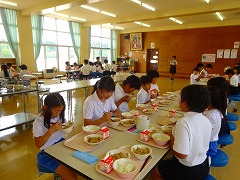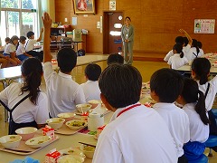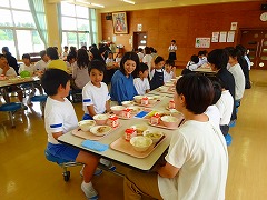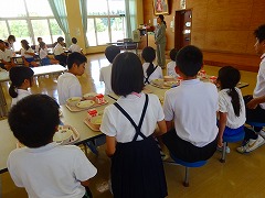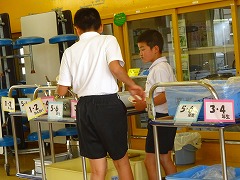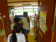 ↑ 完食です。おかずも、ごはんも、牛乳も、お替りしてモリモリ食べて元気いっぱいの笠野小学校です。いつも給食で食べているご飯は、笠野地区でとれたおいしいお米で、他のお米と混ざらないように、特別のラインで炊いてくださっているということです。今日はプールに入ったからでしょうか、食欲の出るメニューなのでしょうか、いつも以上にたくさんの人がお替りをしていました。