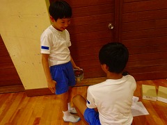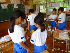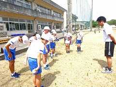 ↑ ソフトボール投げです。M先生の60m超えにはかないませんが、なかなか健闘していました。体重移動を使って、ボールに体重を乗せ、45度の角度に向かって思いっきり投げました。結果が楽しみです。毎日運動することを心がけ、運動能力をさらに伸ばしていきましょう。
