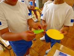 ↑ 3年の英語 What's color is it ? It's yellow. 色の学習をしました。3年生もペアや全体でたくさん会話して英語表現に慣れました。