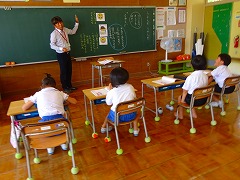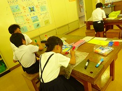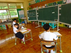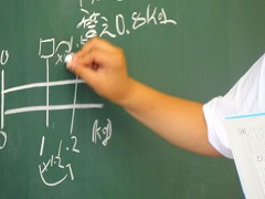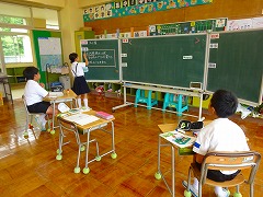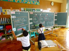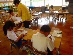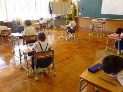 ↑ 放課後の笠野塾です。川岸先生のお力をお借りして、低学年の児童が基礎と活用の力を継続的に育んでいきます。冷房の部屋は快適で、頑張ることができました。