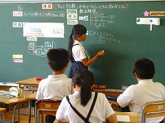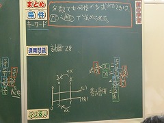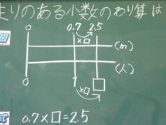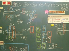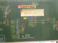 ↑ 5、6年複式算数 この板書は、すべて6年生が書きながら説明し、学び合った足跡です。色分けもして、数直線も描いて説明し合い、学び合いました。6年生の学び合う姿は全校のお手本となっています。