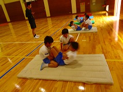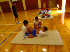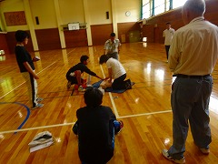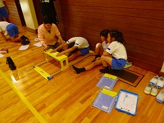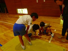 ↑ 上体起こしです。足が浮かないように、補助の児童が測定者の両ひざをおさえて、30秒間に何回上体起こしができるか数えます。