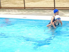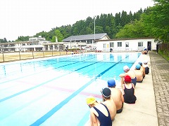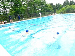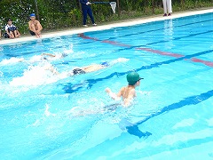 ↓模範水泳です。自分の得意な泳ぎ方で、2年生から6年生の児童が泳ぎを披露してくれました。すいすいと泳ぐ姿に、大きな拍手で称えました。