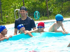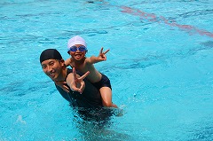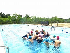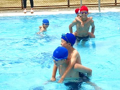 ↓ そのあとで、仲良し班でプールに入りました。小学校のプールに初めて入った1年生は、6年生がおんぶしてくれたので安心でした。