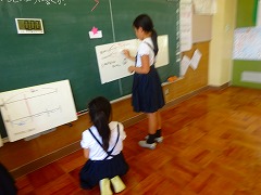 ↑ 5年生も6年生と同じ教室なので6年の学び合う姿を感じ取っています。6年生の学ぶ姿から学び方を学んでいます。自分の考えを図に描いて説明し、考えを聞いている人は、考えをつなげて発言していました。