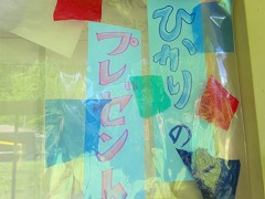 ↑ 2年 テストをしています。廊下では図工の作品が、にじいろにゆらゆらゆれて、まさしく「光のプレゼント」でした。