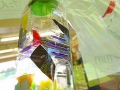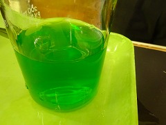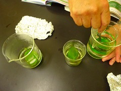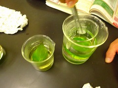 ↑ 葉緑素をエタノールで抜いた後の液です。ジャガイモの葉の光合成の実験を朝から6年生が行っていました。
