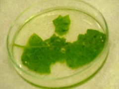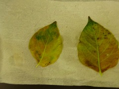 ↑ アルミホイルをかぶせてあったジャガイモの葉の葉緑素を抜き、ヨウ素溶液を垂らしたところ、反応はありませんでした。ということは、でんぷんは作られていません。