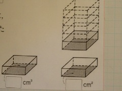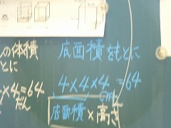 ↑ 6年算数 四角柱の体積をどのようにして求めるか、5年生の体積の求め方を思い出し考えました。考えを交流し、「底面積×高さ」で求められることにたどり着きました。自分たちで公式を導くことができた、「主体的」な学習です。