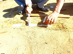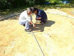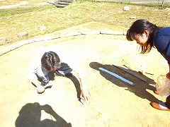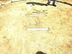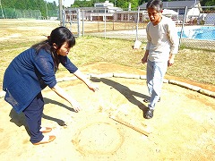 ↑ PTA育成部の方が、相撲場の仕切り線を描く作業をしてくださいました。仕切り線の間は70㎝だそうです。中心を測って、下描きをし、そこに、アクリルペンキを流して作成してくださいました。ありがとうございます。