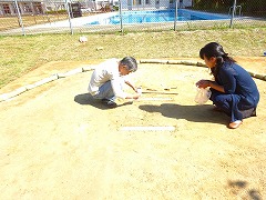 ↑ 4年生 理科 日時計を確認し、夏、暑くなるとどうなっているのか、その変化を探しに出かけました。