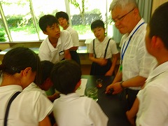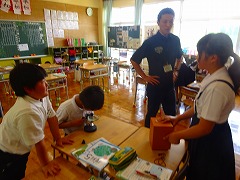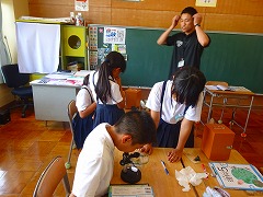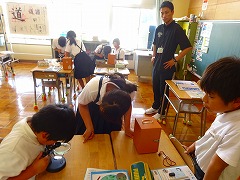 ↑ こちらは、5年生の理科、メダカの観察です。なんと、水草に卵がついていました。顕微鏡で見ると、黒い眼がはっきりと見えました。何日でメダカの赤ちゃんが生まれるのでしょうか。