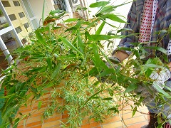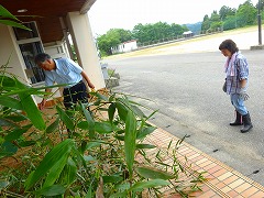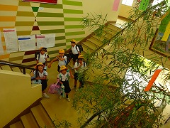 ↑ 笠野公民館の主事さんが、山から笹を切って、笠野小学校子供たちにプレゼントしてくださいました。この笹は、「真竹(まだけ)」という種類で、日本古来からある品種だそうです。よく見ると、笹の花が咲いていたところがありました。笹の花は、「100年に一度だけ咲く」ともいわれるほど、珍しいものだそうです。そっそく、階段に笹を飾り付けました。今年の七夕は、お天気はどうでしょうか。わし座のアルタイル、こと座のベガ、そして、はくちょう座のデネブを天高く仰ぎ見ることができるといいですね。