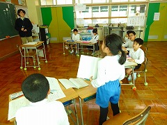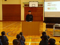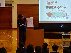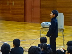↑ 1月の生活目標「気持ちのよいあいさつをしよう」のお話をしました。相手が気持ちよくなるあいさつはどんなあいさつか、児童の意見を聞いてみました。「相手の目を見てあいさつをする」「名前を付けてあいさつをする」「先にあいさつをする」「えがおであいさつをする」等、しっかり分かっていました。1月はこの挨拶をみんなで実践し、あいさつの輪をさらに広げたいと思います。