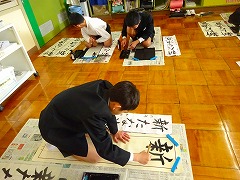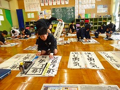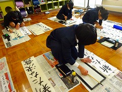 ↓ 始業式の後、教室で一斉に書初めを行いました。心を落ち着けて、すがすがしい気持ちで紙に向かいました。