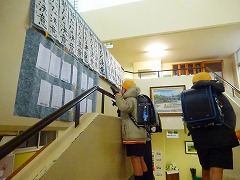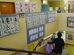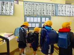 ↑ 校内書初め展をしています。早速、登校した児童が見入っていました。どの作品も力作が勢ぞろいです。冬休み頑張って練習したことが伝わってきます。