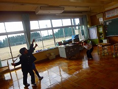 ↑ 2年生が、さっそく外に出て冬見つけです。運動場が凍っていました。バリバリと氷の感触を楽しんでいます!