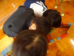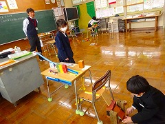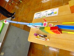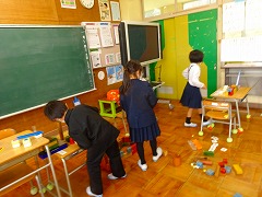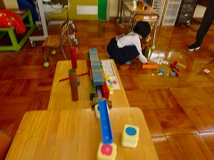 ↑ 1年生が図工で、手品ワールド?を作りました。積み木やおはじきケースを並べ橋や囲いを作り、そのコースに青いビー玉を転がすと、なんと、出てきたのは黄色いビー玉!に変わっていました。その仕掛けを考え、何度も何度も試行錯誤して成功するように微調整する1年生に頼もしさを感じました。みんなでアイディアを出し合い、協力する姿も素敵でした。