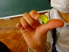 ↑ 朝休み、1年生がおはじき遊びをしていました。朝の光を浴びて、おはじきがこれまた何とも言えず、美しく輝いています。